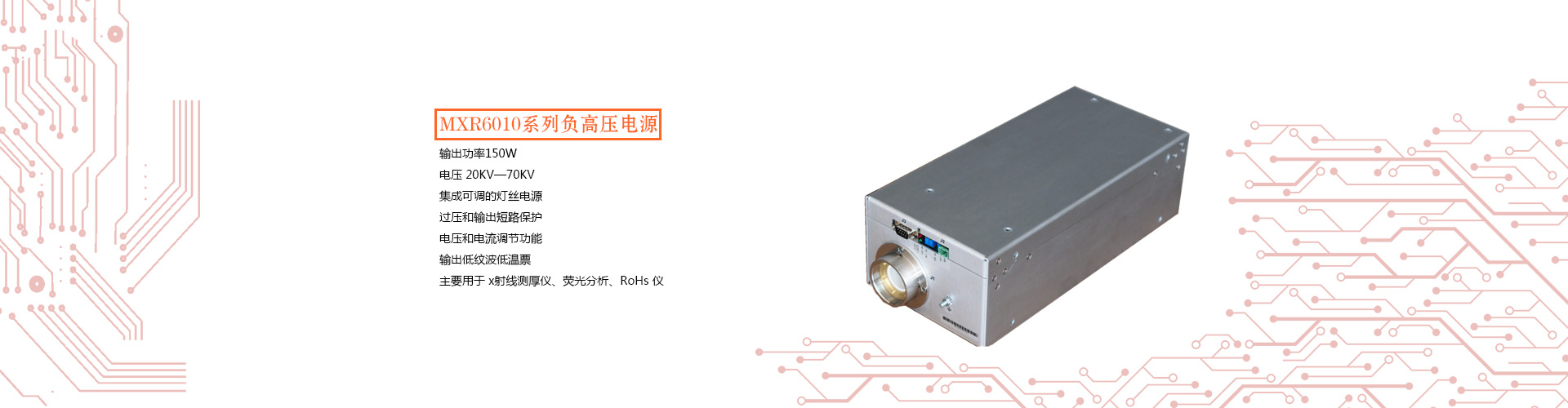 MXRN 系列負(fù)高壓電源是 X 光機(jī)專用高壓電源,射線管陽(yáng)極接地易于散熱。它集成了懸浮可調(diào)的燈絲電源。電源輸出穩(wěn)定低溫漂的高壓,燈絲電源及管流閉環(huán)控制,主要用于熒光分析、RoHs 儀、 測(cè)厚儀等。
